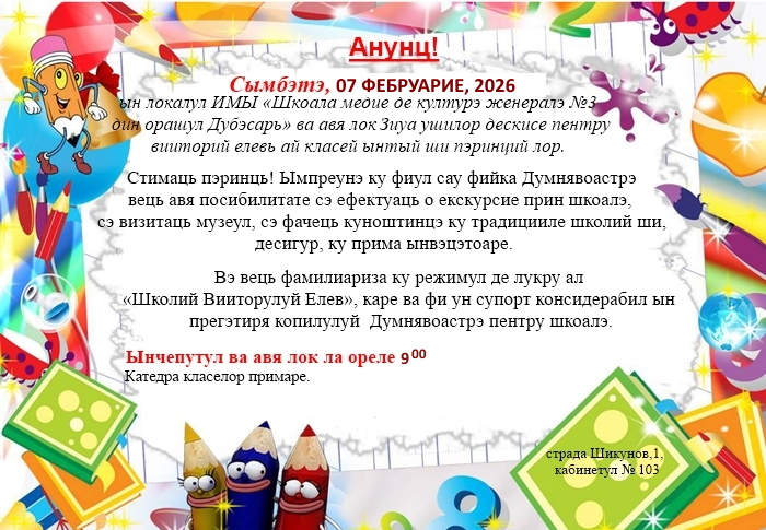 Copyright ИМЫ «Шкоала медие молдовеняскэ де културэ женералэ №3» дин орашул Дубэсарь © 2026